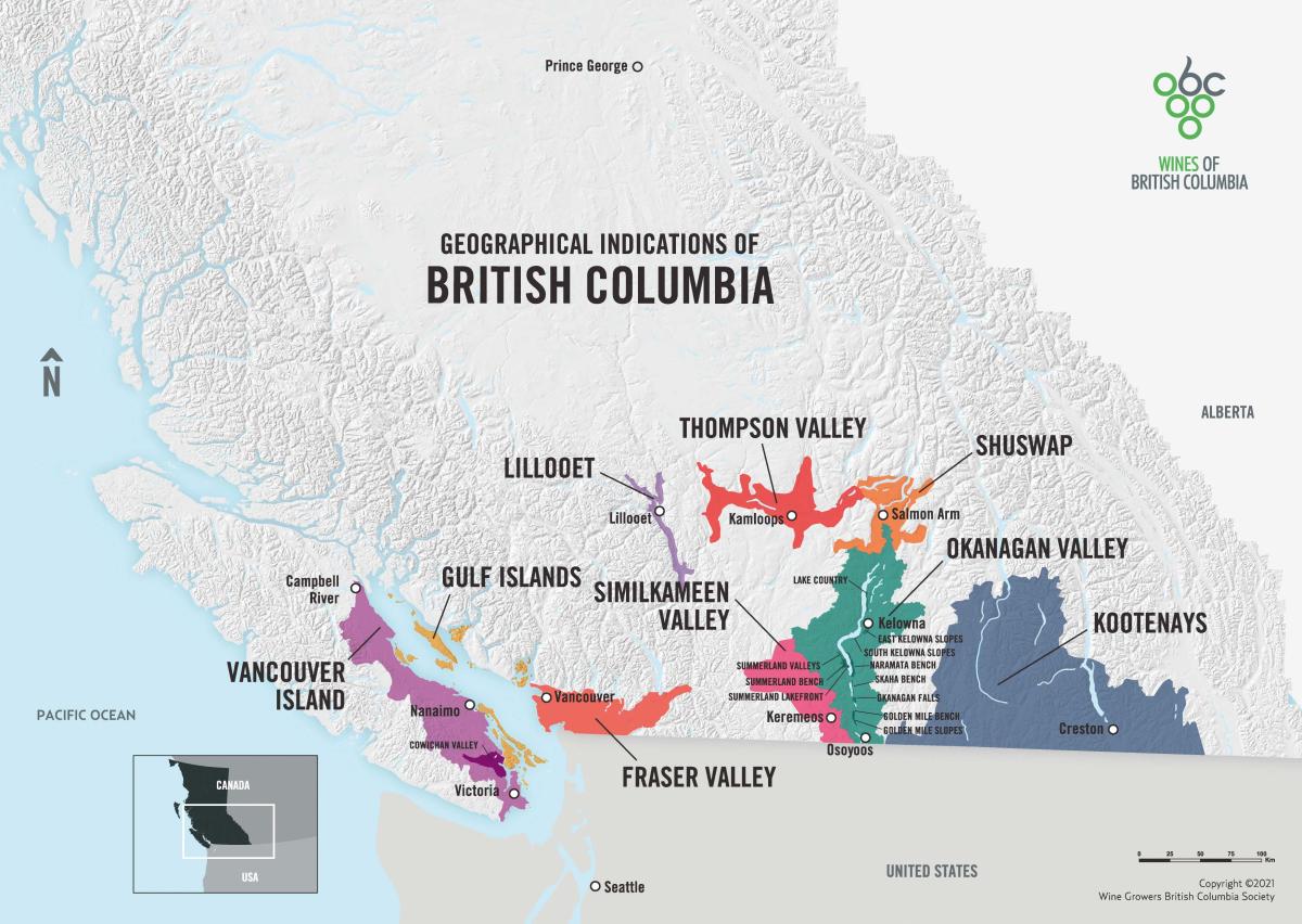British Columbia (BC) is the westernmost province of Canada, bordering the Pacific Ocean. Its southernmost vineyards are situated on the 49th parallel, comparable to Reims in Champagne. Consequently, one might presume that grapes thrive in Canada's exceptionally cool maritime climate. This assumption holds true for the 110 out of the province's 4,500 hectares of vineyards located on Vancouver Island. However, 87% of the vineyard area, totaling 3,900 hectares, is found in the Okanagan Valley, located 217 miles further east and characterized by its continental climate. After Ontario, British Columbia stands as Canada's second most important wine-producing province, boasting over 12,600 hectares of vineyards.