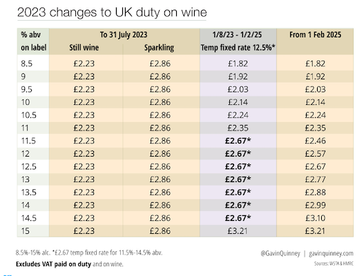 If all of this were not already sufficiently confusing, there will be a further change on February 1, 2025. The duty on wines at 11.5 and 12% will then go down again – by £0.21 ($0.27) and £0.10 ($0.11) respectively, while ones at 12.5% will remain unchanged – at £2.67 ($3.50) and those at 13-14.5 (the most common strengths for classic, higher-quality dry wines) will go up again, with a 14% wine now attracting duty of £3.10 (4.06) - a full £0.87 (1.14) more than its pre July 31st 2022 rate. These duty hikes are made even worse by the fact that they are all subject to 20% VAT sales tax.